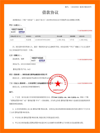 从2016年4月1日起,博金贷网站启用深圳法大大网络科技有限公司的电子合同签名系统。该系统基于可靠数字签名和安全云存储技术,提供在线电子签约、电子合同管理、证据托管等一站式服务。法大大数字签名具有中国金融认证中心(CFCA)的权威认证,加之合同云端加密存储及异地备份,增强了投资用户的合同安全性。启用法大大电子合同签名系统后,2016年4月1日以后签署的合同和截至该日尚未到期的合同将会加盖一个与个人/企业身份相绑定的数字签名证书,截至2016年4月1日已经到期的合同的电子签名不变。法大大电子签名的效果如下图所示